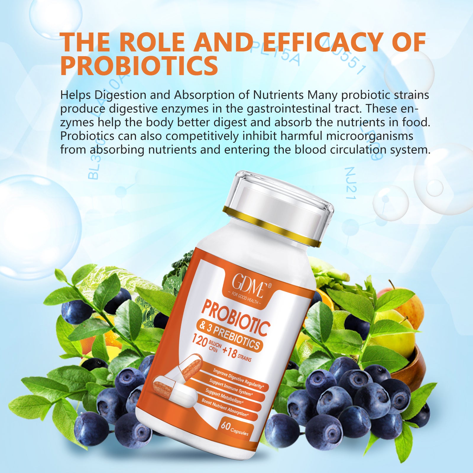 - 120 Billion Probiotics for Men & Women: GDME 120 Billion Probiotics Scientifically backed and clinically proven, this dietary supplement contains 120 billion active bacteria, 18 types of bacteria beads, and 3 types of prebiotics to help probiotics survive stomach acid and reach gut for maximum absorption and digestive health benefits.