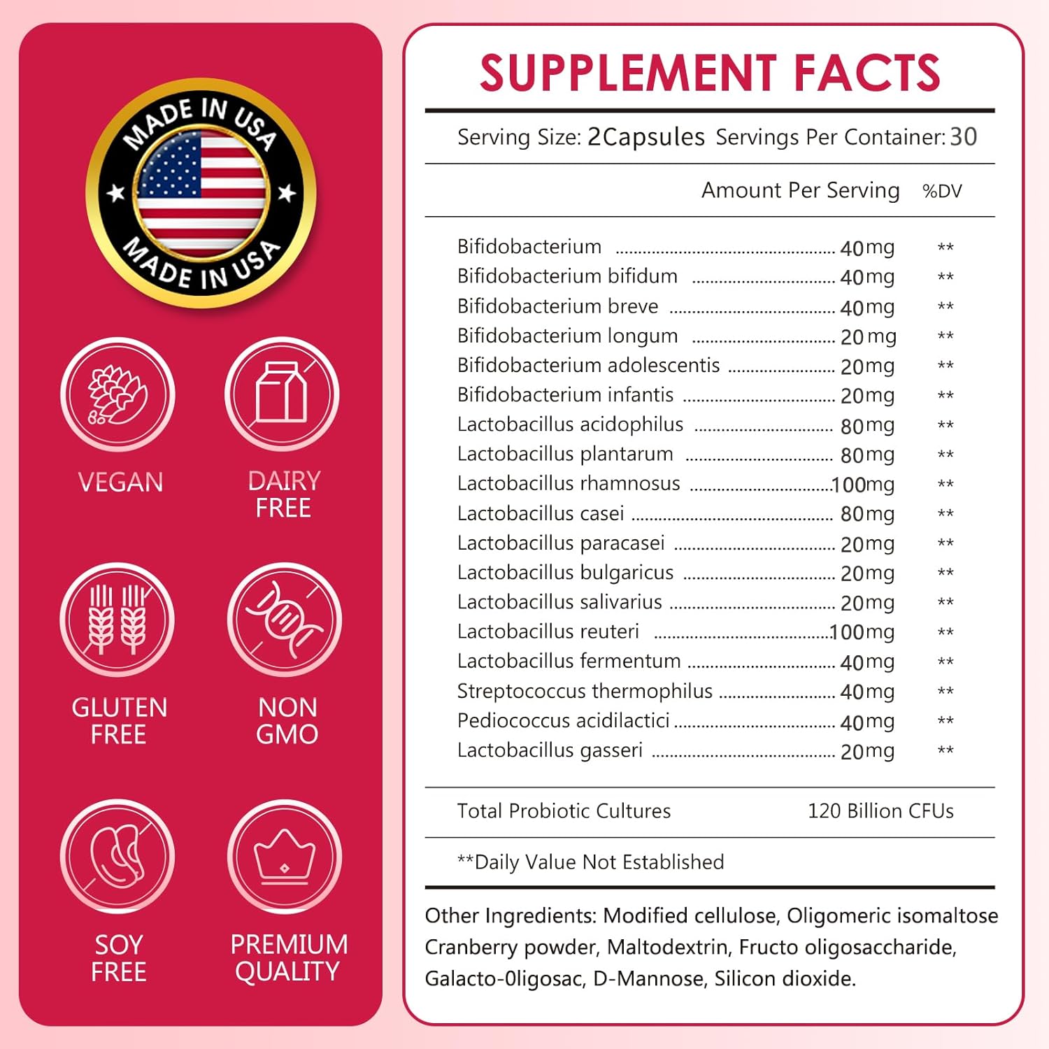 Women's Probiotics120 Billion CFUs 18 Strains 3 Prebiotics & Digestive Enzymes Contains Organic Prebiotic Cranberry Women's Health Digestive & Immune Support Non-GMO Soy Gluten Dairy Free
